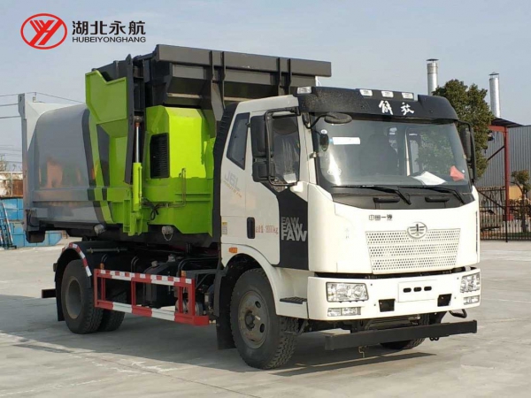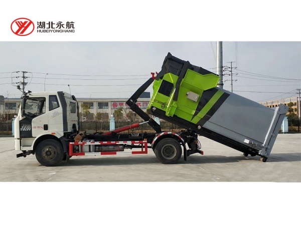 该车主要由拉臂钩总成、可移动箱体总成、液压系统、液压锁紧总成、电液操作系统组成,能实现一车与多个垃圾箱联合循环作业运输,整车具有结构简单、操作方便、装卸效率高、机械自动化程度高、节省人力的优点。