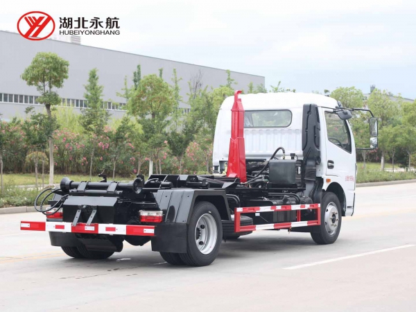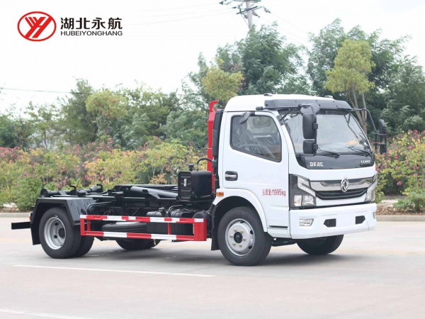 该车主要由拉臂钩总成、可移动箱体总成、液压系统、液压锁紧总成、电液操作系统组成,能实现一车与多个垃圾箱联合循环作业运输,整车具有结构简单、操作方便、装卸效率高、机械自动化程度高、节省人力的优点。