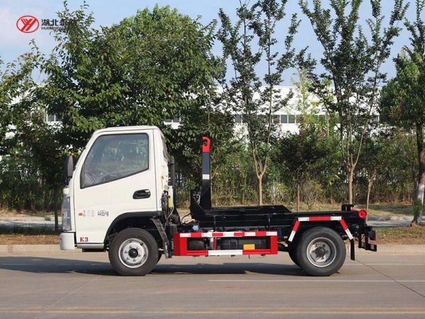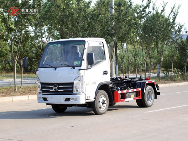 该车主要由拉臂钩总成、可移动箱体总成、液压系统、液压锁紧总成、电液操作系统组成,能实现一车与多个垃圾箱联合循环作业运输,整车具有结构简单、操作方便、装卸效率高、机械自动化程度高、节省人力的优点。
