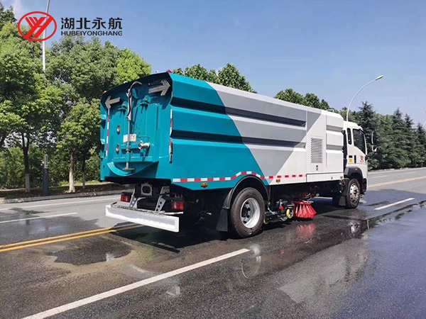 该车集扫路车、洒水车和高压清洗车功能于一体,采用“中置两立扫+中置宽吸嘴(内置高压水喷杆)+左右高压侧喷杆”的结构。