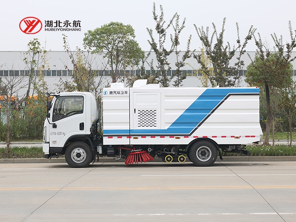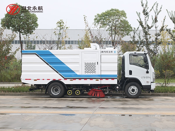 该车集扫路车、洒水车和高压清洗车功能于一体,采用“中置两立扫+中置宽吸嘴(内置高压水喷杆)+左右高压侧喷杆”的结构。