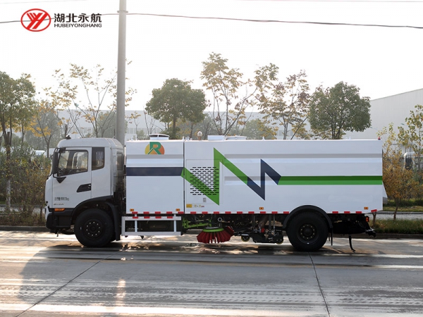 该车集扫路车、洒水车和高压清洗车功能于一体,采用“中置两立扫+中置宽吸嘴(内置高压水喷杆)+左右高压侧喷杆”的结构。