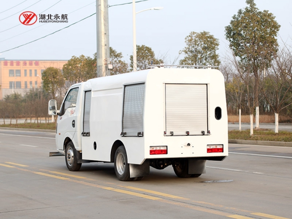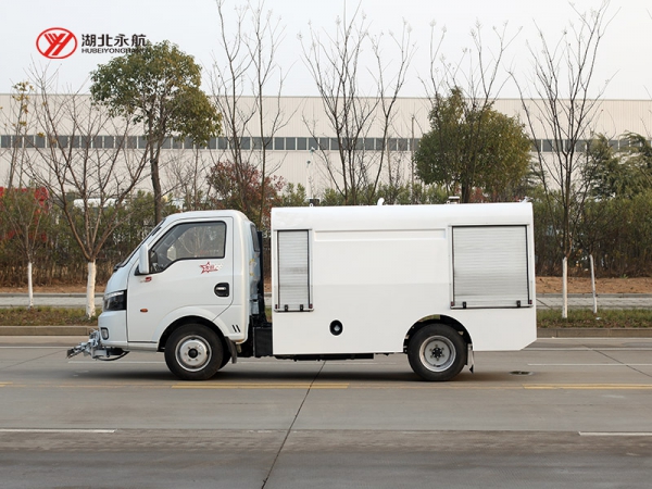 路面养护车采用国内知名品牌底盘改装,加装高压清洗机系统、整体式水箱(含清水仓、工具仓、动力仓)、前喷水架及定点清洗装置、电气系统、高压水路及卷盘装置、辅助清洗推车等部件。