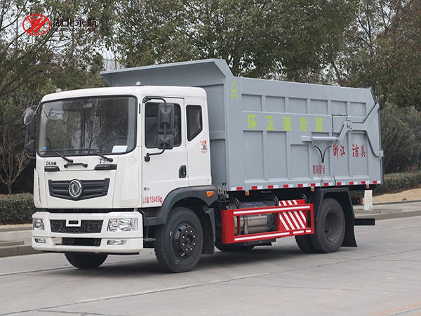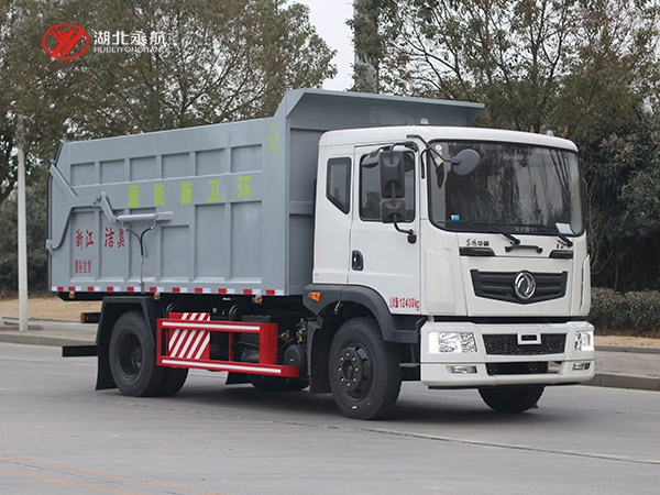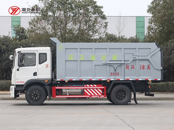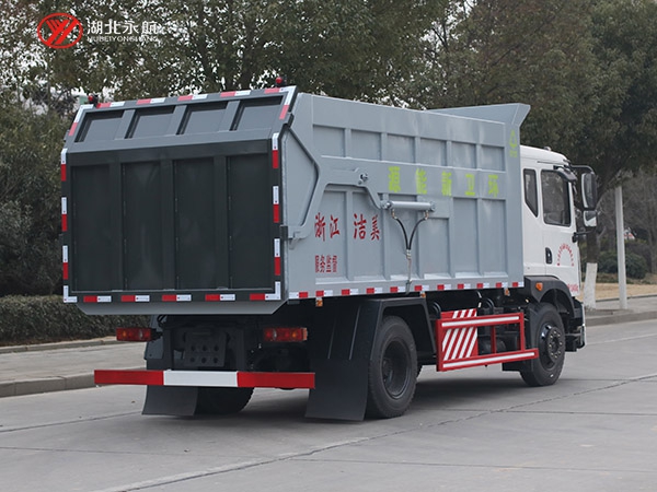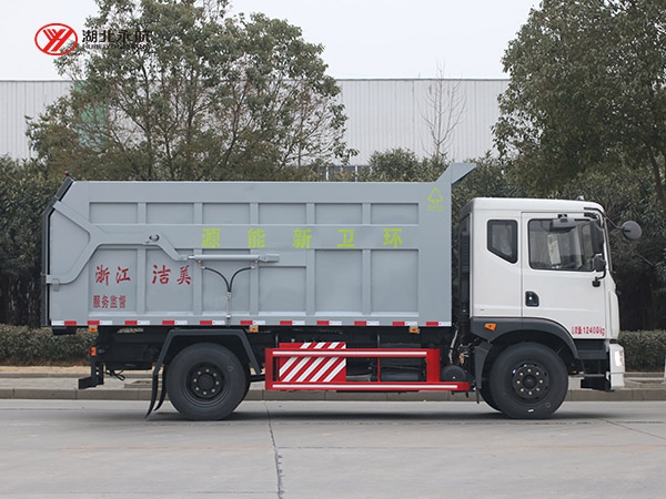 方形箱体,顶部有翼展开盖式和全封闭式两种。其中箱体顶部开盖式对接垃圾车主要用于散装垃圾的收运,也有部分用于与大型垂直式垃圾压缩机配套使用,而全封闭式对接垃圾车主要用于与中小型垃圾压缩机配套使用。