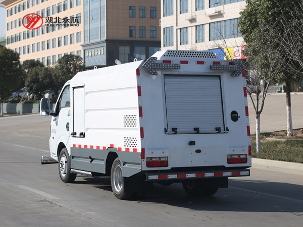 路面养护车采用国内知名品牌底盘改装,加装高压清洗机系统、整体式水箱(含清水仓、工具仓、动力仓)、前喷水架及定点清洗装置、电气系统、高压水路及卷盘装置、辅助清洗推车等部件。