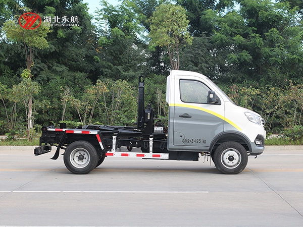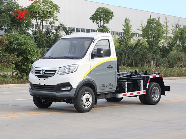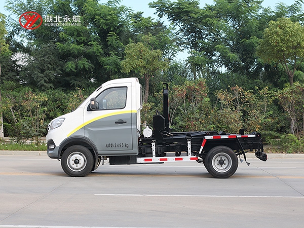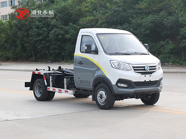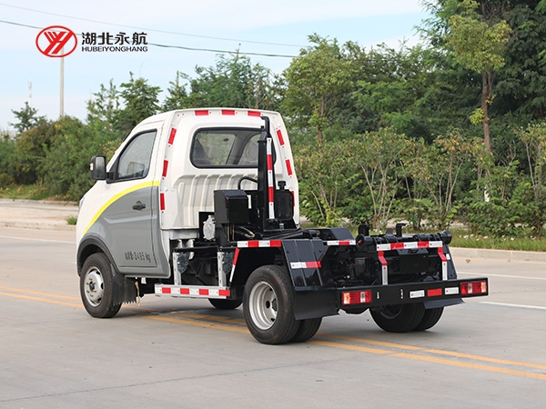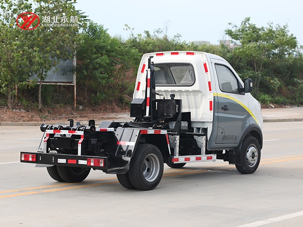 该车主要由拉臂钩总成、可移动箱体总成、液压系统、液压锁紧总成、电液操作系统组成,能实现一车与多个垃圾箱联合循环作业运输,整车具有结构简单、操作方便、装卸效率高、机械自动化程度高、节省人力的优点。