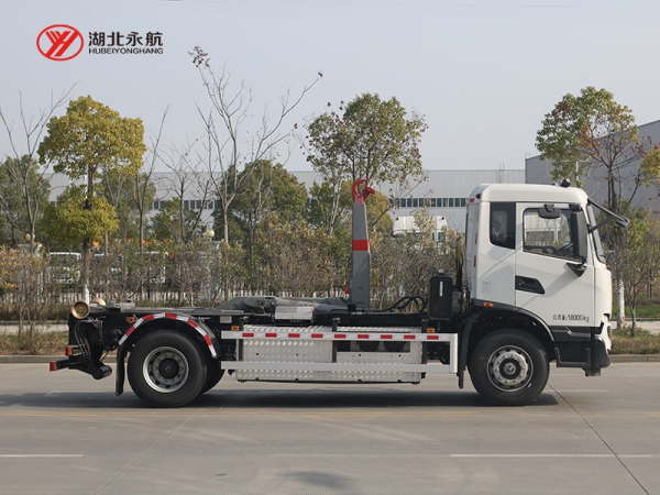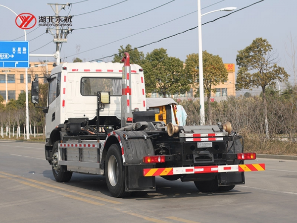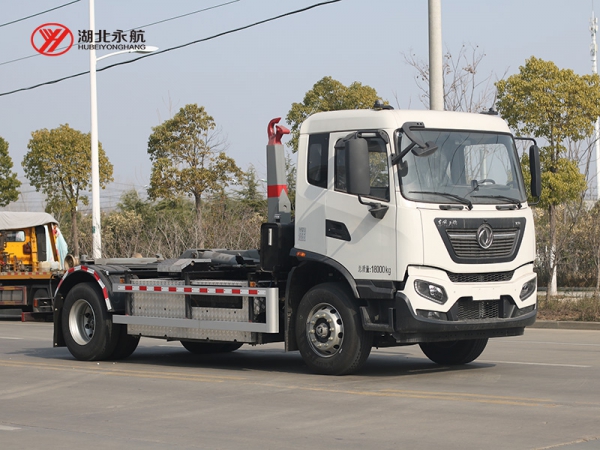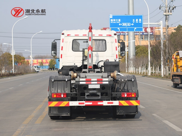 该车主要由拉臂钩总成、可移动箱体总成、液压系统、液压锁紧总成、电液操作系统组成,能实现一车与多个垃圾箱联合循环作业运输,整车具有结构简单、操作方便、装卸效率高、机械自动化程度高、节省人力的优点。
