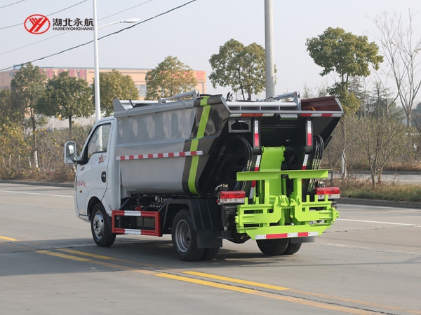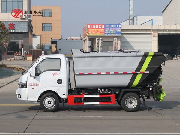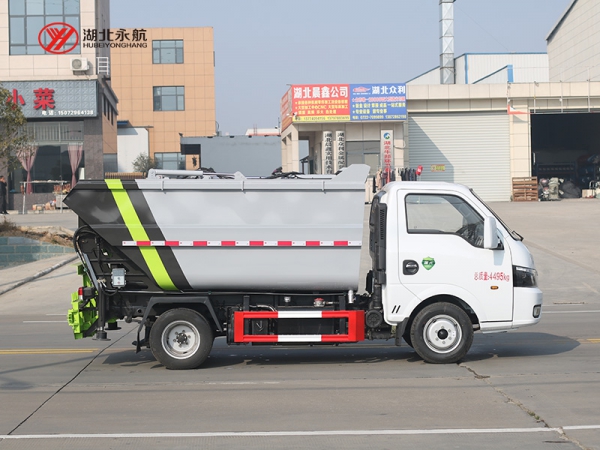 该车采用二类汽车底盘,加装高位倾翻垃圾箱、翻桶机构、刮板压缩装置、液压系统和电控系统,整车外形美观、驾驶舒适、操纵便捷、机动灵活。
