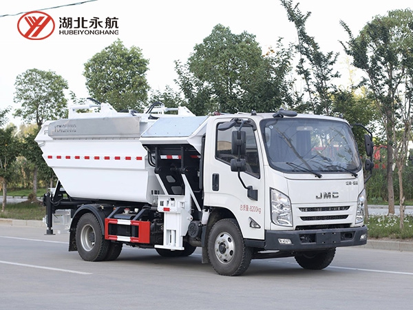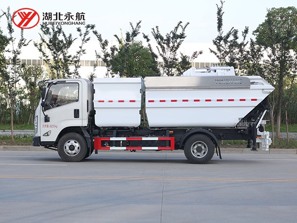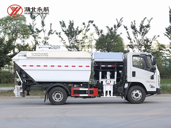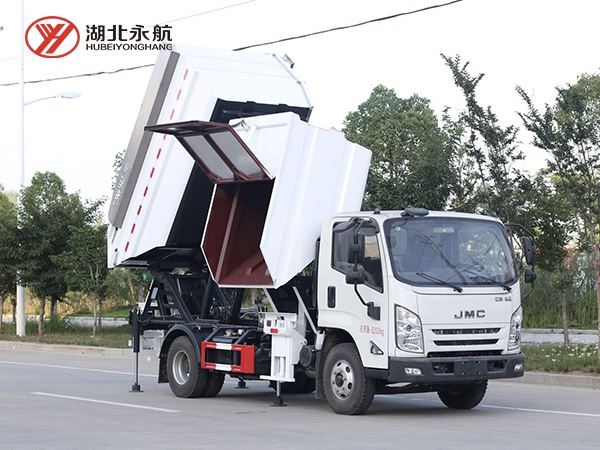 该车由汽车二类底盘加装垃圾箱、翻桶机构、副车架、液压系统和电控系统等专用工作装置改装而成,兼具垃圾分类收集投放、多方位垃圾上料方式、垃圾压缩及对接卸料功能。