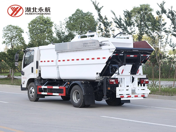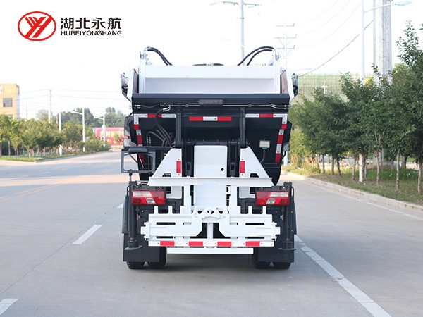 3、后垃圾箱全密闭设计,具有刮板和滑板装填机构,大大增加垃圾装载量;