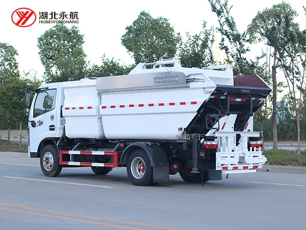 3、后垃圾箱全密闭设计,具有刮板和滑板装填机构,大大增加垃圾装载量;