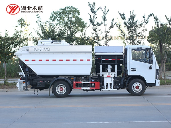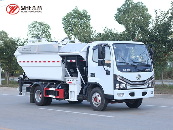 该车由汽车二类底盘加装垃圾箱、翻桶机构、副车架、液压系统和电控系统等专用工作装置改装而成,兼具垃圾分类收集投放、多方位垃圾上料方式、垃圾压缩及对接卸料功能。