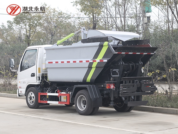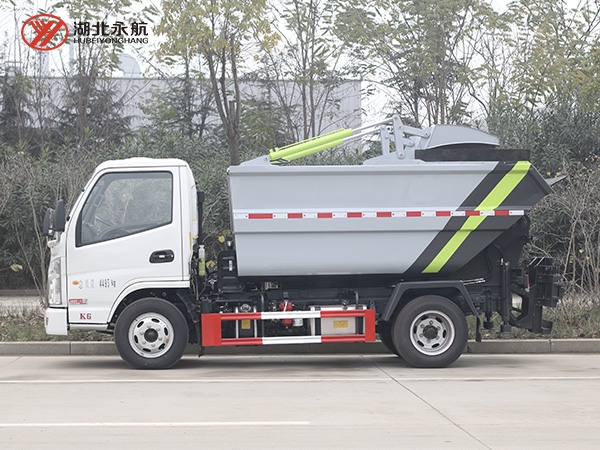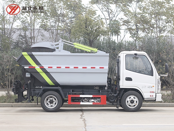 该车采用二类汽车底盘,加装高位倾翻垃圾箱、翻桶机构、刮板压缩装置、液压系统和电控系统,整车外形美观、驾驶舒适、操纵便捷、机动灵活。