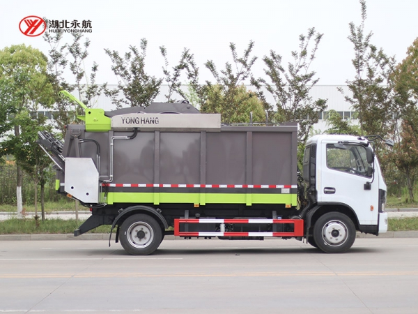 与传统后装压缩式垃圾车相比,无泄漏压缩式垃圾车取消了填装器,将压缩机构布置在垃圾箱顶部,并采用新型油缸驱动压桶板进行压桶式上料机构,适用性强,工作稳定可靠。