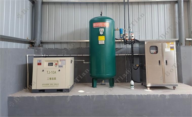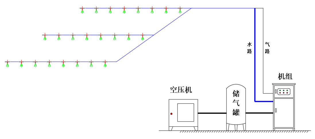 双流体雾化喷淋机组包含主机、空压机和储气罐。主机采用不锈钢外壳,集电机、自吸泵、水箱和电气控制为一体,具有配电、控制、保护、显示报警等功能。可任意调节喷雾时间,实现自动间歇喷雾。PLC控制,添加触摸屏及自动加药装置,可实现手动/自动,远程/就地操作