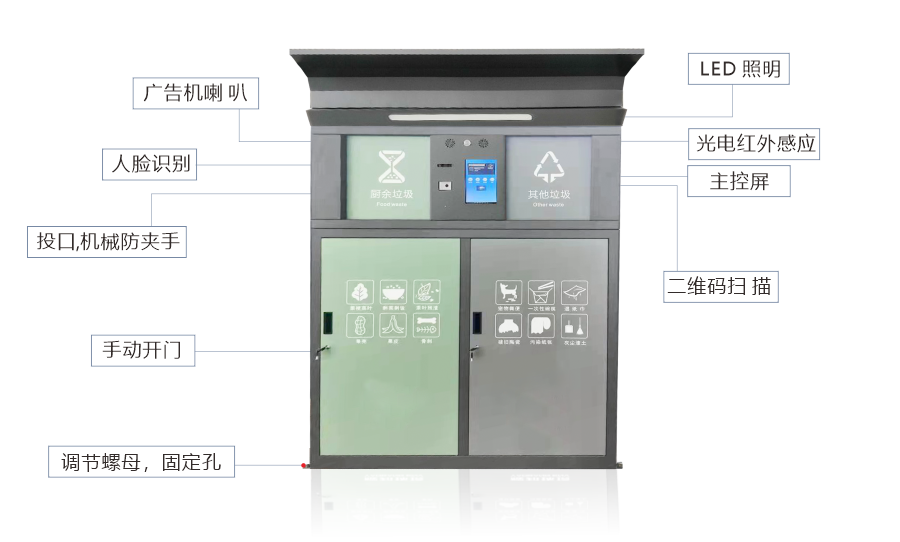 智能垃圾分类回收设备,依托最先进的人工智能、大数据、物联网、云计算、AI等技术,对垃圾分类各环节进行智能化管理。该设备拥有人脸识别、二维码识别等多种体验方式,配置自动称重、智能投递、便捷照明、烟雾报警等功能。自主研发生产、外观精致时尚、科技感爆棚,引领垃圾分类新潮流。