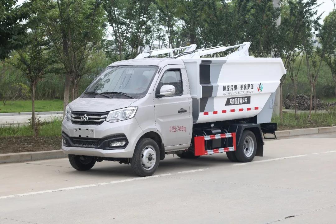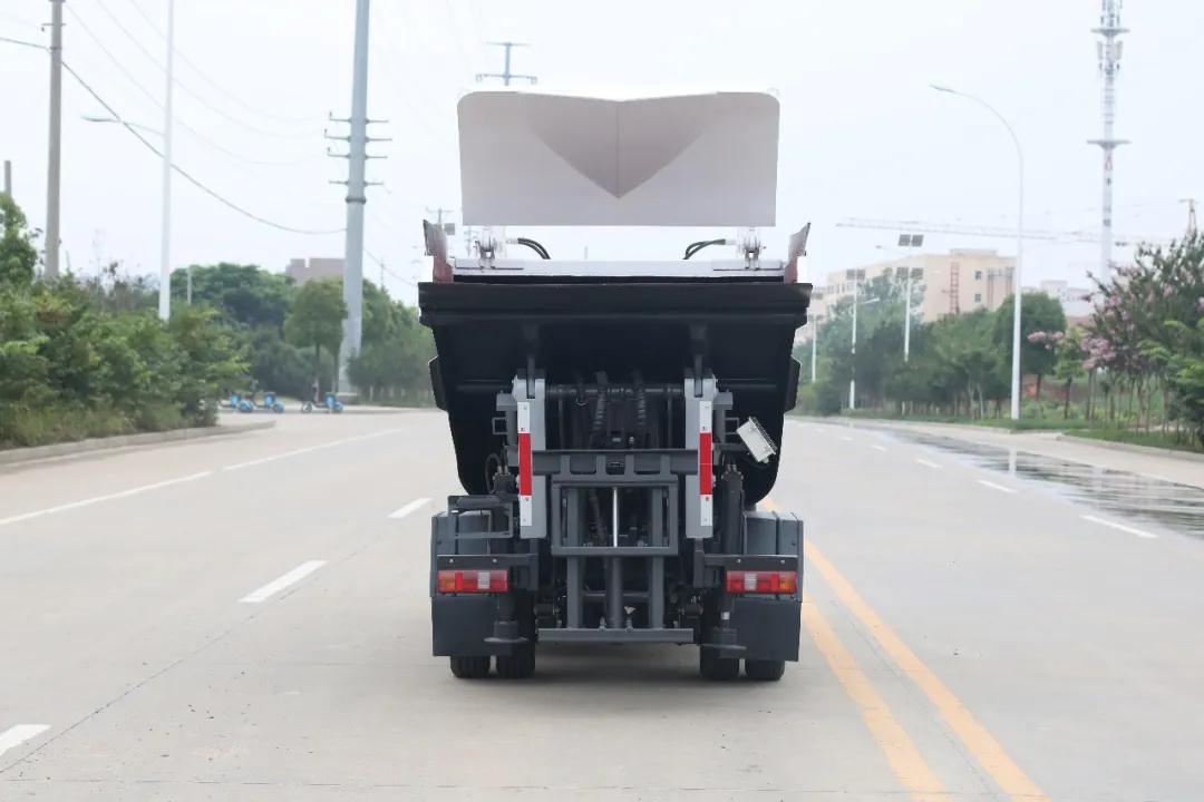 2、采用后翻桶机构,在狭窄街道和小区作业更加方便。新款翻桶架大大提高了翻桶机构的适应性和可靠性。