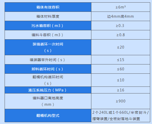 8、不同用户可根据不同的垃圾收集方式选装不同的翻桶(斗)机构:铁桶(300升)、塑料桶(240升、660升、1100升)、半密封三角斗(600升)、全密封落地斗(700L)和提斗摆臂机构。