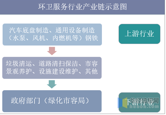 环卫服务是城市公用事业的一部分,工作内容为对城市环境卫生和市容市貌进行管理和维护,主要包括:(1)城乡道路、广场等公共区域的清扫保洁、洒水作业;(2)居民区、城乡道路、公共区域、水域的生活垃圾收集、清运;(3)环卫设备如公厕、垃圾箱、垃圾中转站的建设、维护和运营;(4)城市垃圾、粪便、特种垃圾的终端无害化处理;(5)城市市容景观绿化的规划、建设和养护等。环卫服务行业的上游是环卫机械装备制造行业,下游客户主要是各级部门以及商业、工业企业等。
