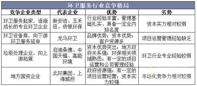 目前,环卫行业已经具备一定规模的公司,主要分为4类:1)环卫服务起家,逐渐长大的老牌环卫公司,典型代表玉禾田、侨银环保、新安洁,该类公司项目经验丰富,具有一定品牌优势和先发优势,资本实力也在上市后迎头赶上;2)环卫设备商,向环卫服务转型,典型如龙马环卫、中联环境(现为盈峰环境),环卫设备龙头企业,龙马环卫和中联环境在高端环卫设备的市占率高,具有很好的品牌优势,且具备资本实力,从业务上看是由产业链上游向下游延伸,具备一定的协同效应,但由于业务模式差异较大,项目管理经验上较传统的环卫公司略有欠缺;3)垃圾处理公司,向上游拓展,典型如启迪桑德、天楹,大项目管理能力、资本实力、异地扩张能力层面均非常强,在品牌影响力和环卫项目经验上有欠缺;4)地方国资企业,如北环集团、上海城投,优势在于资源强大。