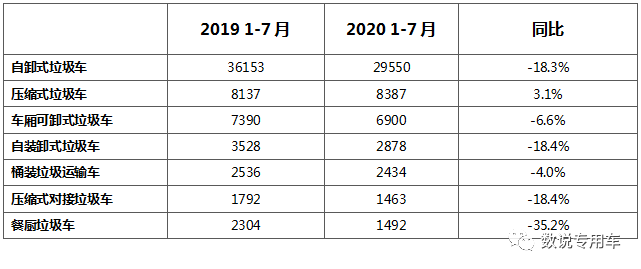 2020年1-7月压缩式垃圾车销量保持增长,稳居各类垃圾车同比增长率前排。