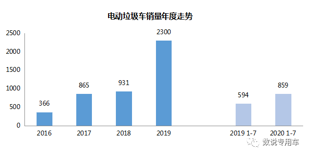2018年7月国务院关于印发的《打赢蓝天保卫战三年行动计划》中要求“加快推进城市建成区新增和更新的公交、环卫、邮政、出租、通勤、轻型物流配送车辆使用新能源或清洁能源汽车,核心区域使用比例达到80%。” 2019年电动垃圾车销量增长147%。今年1-7月,电动垃圾车销量同比增长44.6%。