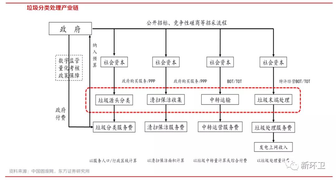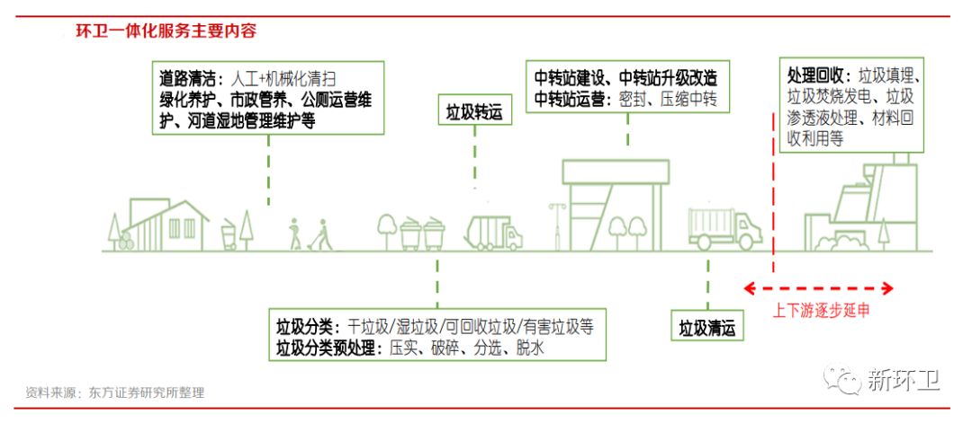 环卫业务环节的一体化指的是服务内容的增加以及产业上下游链条的多维度整合。具体来说,即环卫项目突破传统意义上的清扫保洁、垃圾清运,将清扫、保洁、中转、收运、处理进行一体化打包,同时涉及垃圾分类、餐厨垃圾收运处理、绿化养护、市政管养等内容,随着未来人们对生活环境要求的不断提高,将会不断纳入新的服务项目。