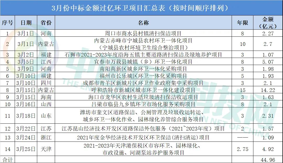 一季度,盈峰环境中标4个亿级环卫项目,金额合计44.24亿元。在业务板块上,盈峰环境先后中标湖南省湘潭市环卫一体化项目,以及海南省三亚市天涯区环卫一体化项目。湘潭市项目涵盖垃圾分类投放系统、清扫保洁系统、智能环卫系统等六部分,将加快智慧环卫服务与智慧城市建设的无缝对接。海南省项目则实现了空白区域的市场突破,优化了行业布局。在对外合作方面,1月,盈峰环境与美的物业在佛山签署战略合作协议,双方将围绕智慧清洁示范性社区的打造以及城市运营服务等开展强强合作,通过硬件设备与管理系统的优势结合,共同开发城市服务业务。此外,盈峰环境紧跟“两会”热词,将扎实做好碳达峰、碳中和各项工作列入2021年核心任务。二季度已经过了一半有余,届时又将会有哪些企业入围TOP10榜单,我们拭目以待!
