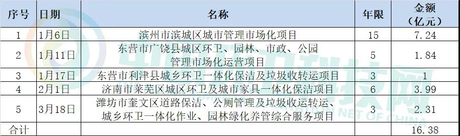 山东省一季度共中标5个亿级环卫项目,从项目内容来看,涵盖保洁、垃圾收运、园林绿化、市政、公厕管理等各个方面,涉及面较广。近年来,山东省大力推行环卫市场化建设,已经发布多个相关文件、规章制度。如2020年9月,山东省住房和城乡建设厅发布《山东省城市精细化管理标准:环境卫生管理》,对城市道路精细化保洁质量标准做了详尽的说明,旨在全面规范环境卫生管理工作。