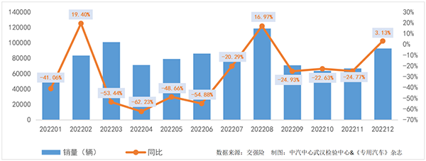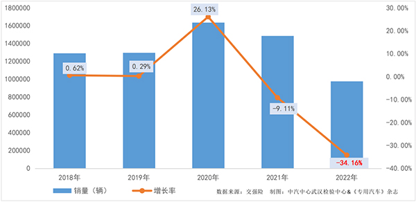 2022年专用汽车六大类共销售97.9万辆,同比下滑34.16%,全国销量五年来降幅最大。