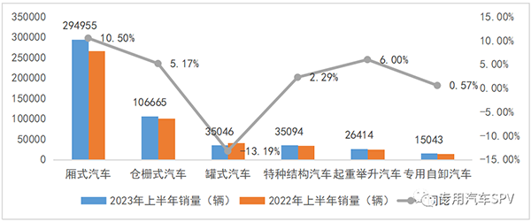 2023年上半年专用汽车六大类中,厢式汽车累计销售29.50万辆,同比上涨10.50%;仓栅式汽车累计销售10.67万辆,同比上涨5.17%;罐式汽车累计销售3.50万辆,同比下滑13.19%;特种结构车累计销售3.51万辆,同比上涨2.29%;起重举升汽车累计销售2.64万辆,同比上涨6.00%;专用自卸汽车累计销售1.50万辆,同比上涨0.57%。可以看出,2023年上半年仅罐式汽车同比下滑13.19%,其他五大类同比呈现不同幅度上涨。如下图:2023年上半年专用汽车六大类产品销量情况表