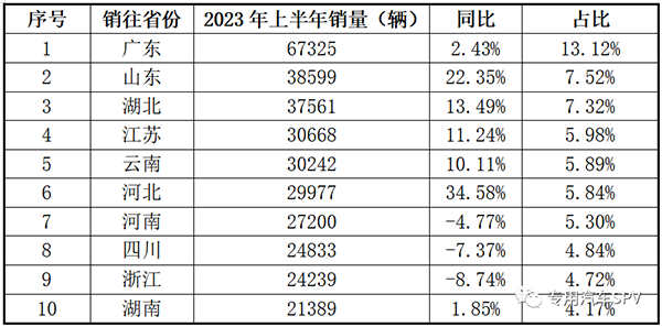 从销售省份来看,广东、山东等地是产品主要需求大省。上半年销量超过3万辆的省份有广东、山东、湖北、江苏、云南,这5省份销量占全国总销量近40%。2023年上半年销量TOP 10的省份中,河南、四川、浙江同比均下滑,涨幅最大的为河北省,同比上涨34.58%。