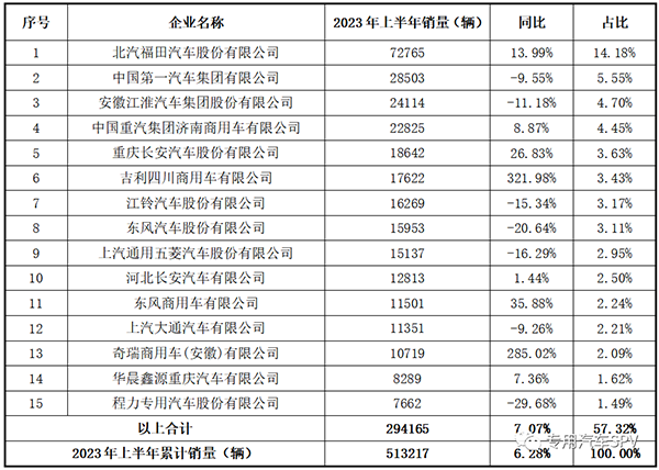 2023年上半年共有971家专用汽车企业实现车辆销售,较2022年上半年的857家同比增长13.30%。2023年上半年,北汽福田、一汽集团和江淮汽车销量位居前三甲。销量Top15的企业总销售29.42万辆,占比近60%,仅北汽福田一家占比 14.18%。较去年同期相比涨幅较大的企业有吉利四川商用车、奇瑞商用车,同比分别为321.98%和285.02%。2023年上半年全国专用汽车主要销售企业情况